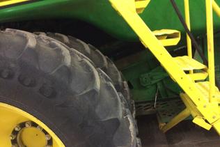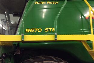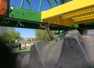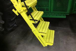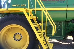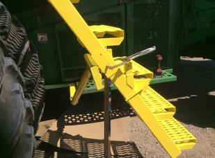 2. Slide ladder up tire until lip of ladder rests on platform and position left to right as desired. (center on hand rail holes on 50-60-70 Sts series,the left edge of ladder will be on outer edge of upper platform when mounted to S series John Deere combines) after lip of ladder is resting on platform lift rear of ladder to desired height (insert a 38 inch board under third step ,this will give you a 18 inch step height) step hight can be raised or lowered to desired height by simply sliding step bracket up or down along ladder rails as shown when in position clamp with c clamp.