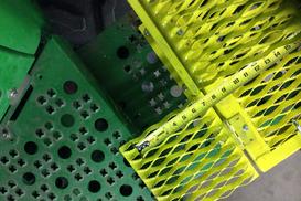 3. After ladder lip and lower ladder brackets are securely clamped, drill three holes through lip and platform and bolt into place. (because not all platforms are not square with combine body, do not be concerned if platform doesn't contact the full width of ladder, that is why ladder lip holes are not pre drilled) c clamp in left outer corner as shown will allow you to square ladder with body leaving about a four inch gap between gulwing door and ladder.